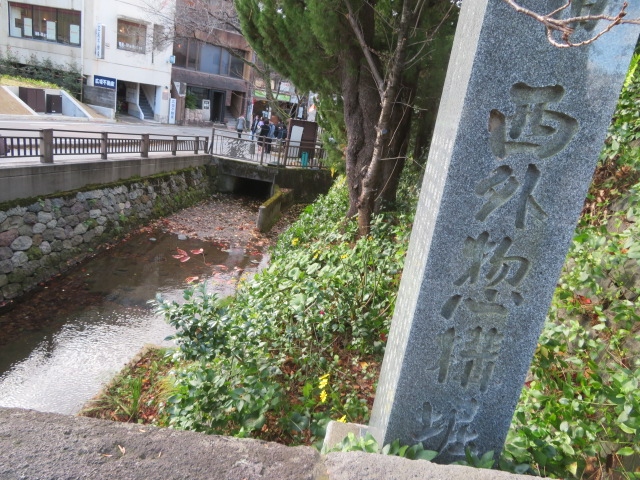 金沢城の惣構跡はいくつか見ましたが、こちらには案内板のほかに、「西外惣構堀」と書かれた石碑もありました。惣構は、金沢城を守るためのお堀や土塁などの防御施設ですが、用水を流れるこの水が防御の役割をしていたんだなとわかりました。