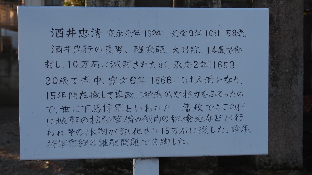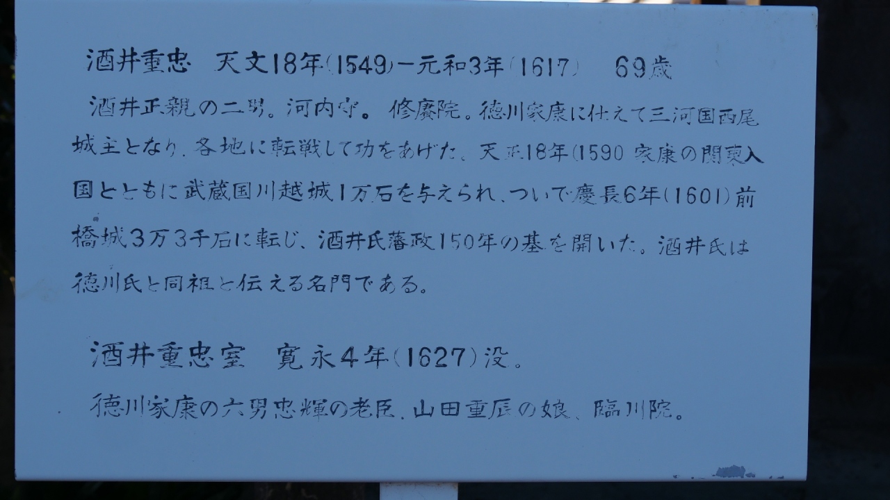 初代・重忠、2代・忠世のお墓が立派なのは徳川家康を助けた功臣であり納得でしたが、「下馬将軍」と言われたほどの権力者だった4代・忠清のお墓はさほどでもなかったのはちょっと意外でした。