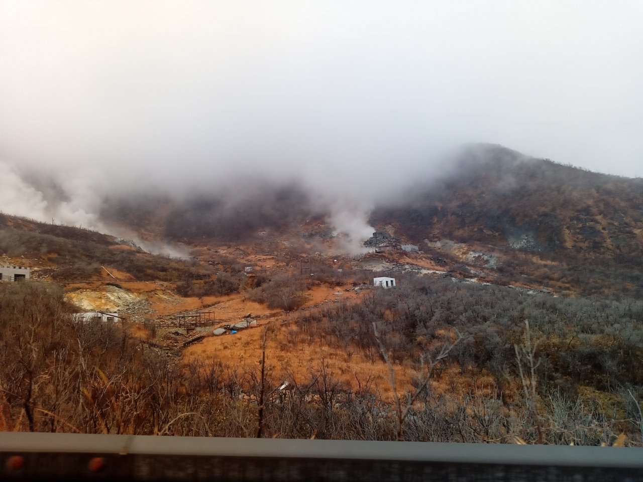 箱根の「大涌谷」を訪れました。雨が降っている日となってしまい、大涌谷全体がどんよりとしたちょっと暗い風景となっていました。気温が低いこともあり、噴煙がのぼっている様子がとてもハッキリとわかりました。力強く湧き出しています。