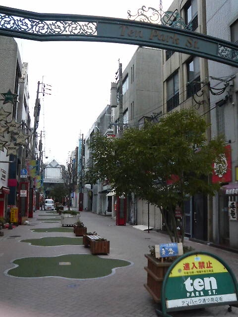 天文館の近く、人工芝や街路樹など潤いたっぷりの商店街です