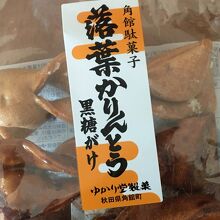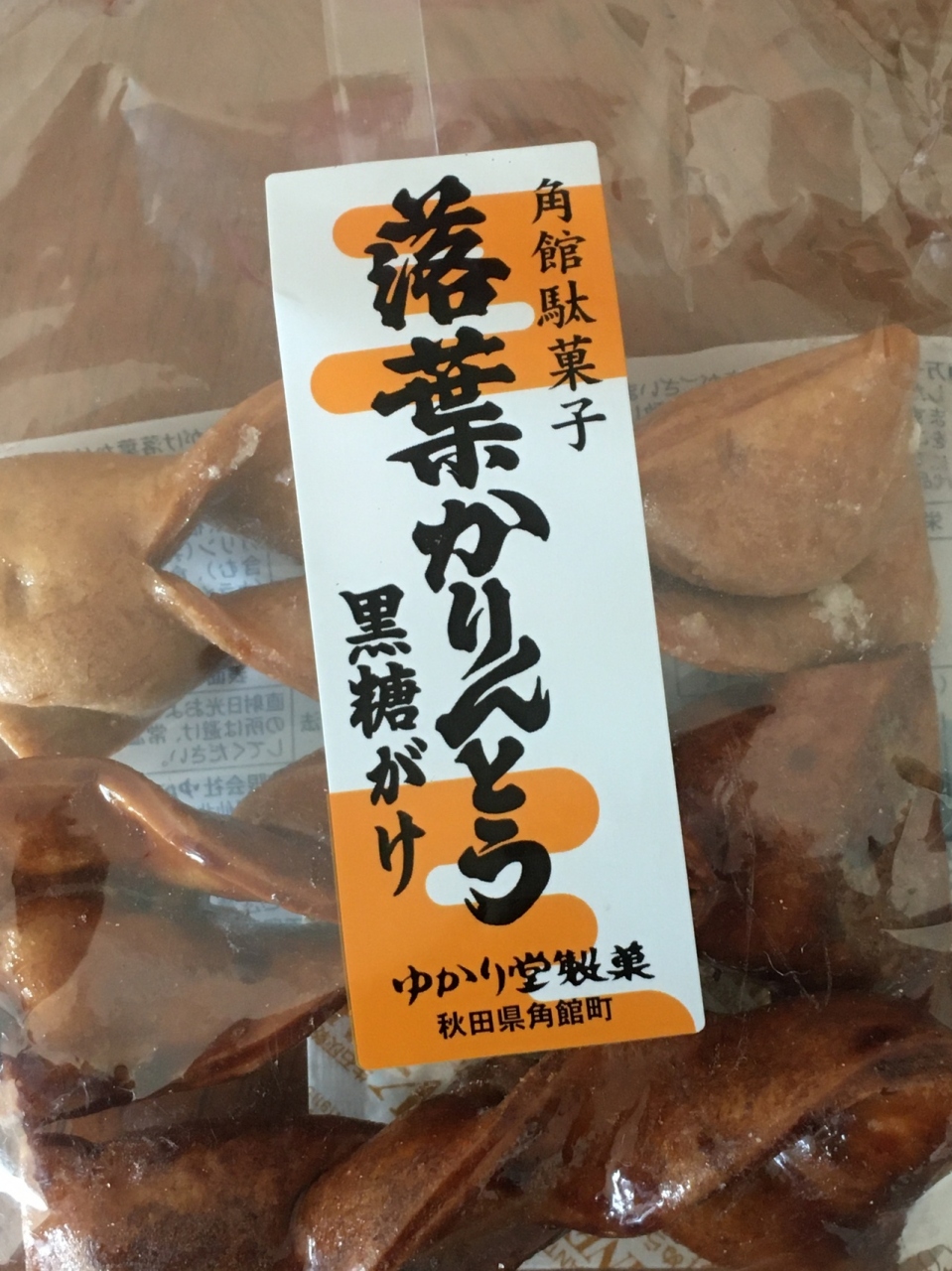秋田県角館の名物「落ち葉かりんとう」です。まずその大きさにビックリ。ゆうに10cmは超える長さで、ひと口では食べられません。歯ごたえがありバリバリと音を立てて食べます。甘さ控えめで黒蜜の味がしっかりとして素朴な懐かしい味です。「落ち葉かりんとう」ならではの食感と味わいは他にはなく、癖になります。お値段も手頃でおすすめです。