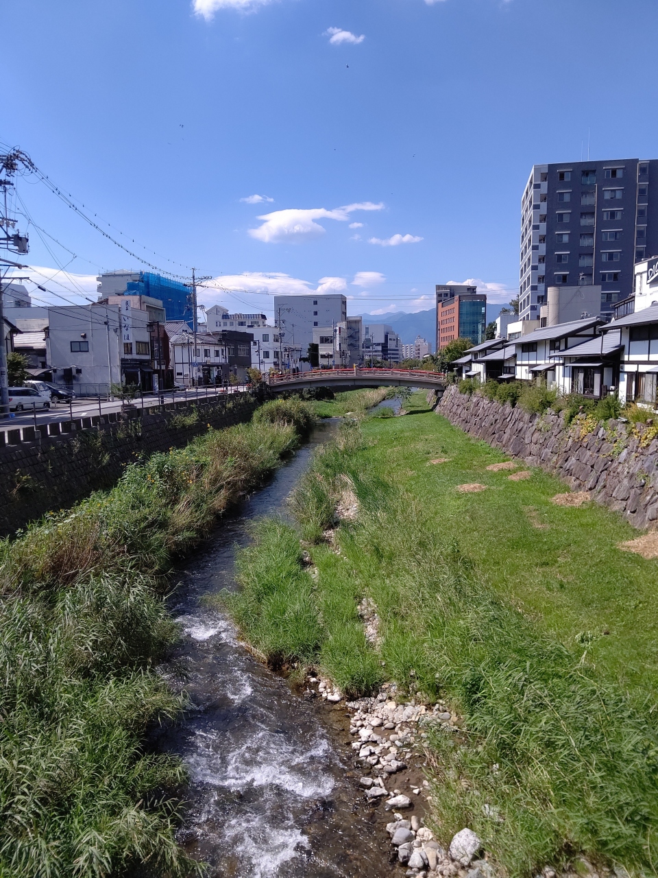 松本市内を流れる川です。そんなに大きくない川ですが、千曲川と合流する信濃川水系の一級河川です。初夏にはホタルやカジカガエルが生息し自然を満喫できます。川沿いには多くの商店街がひしめき合い賑わっています。川沿いで休憩する観光客もいます。