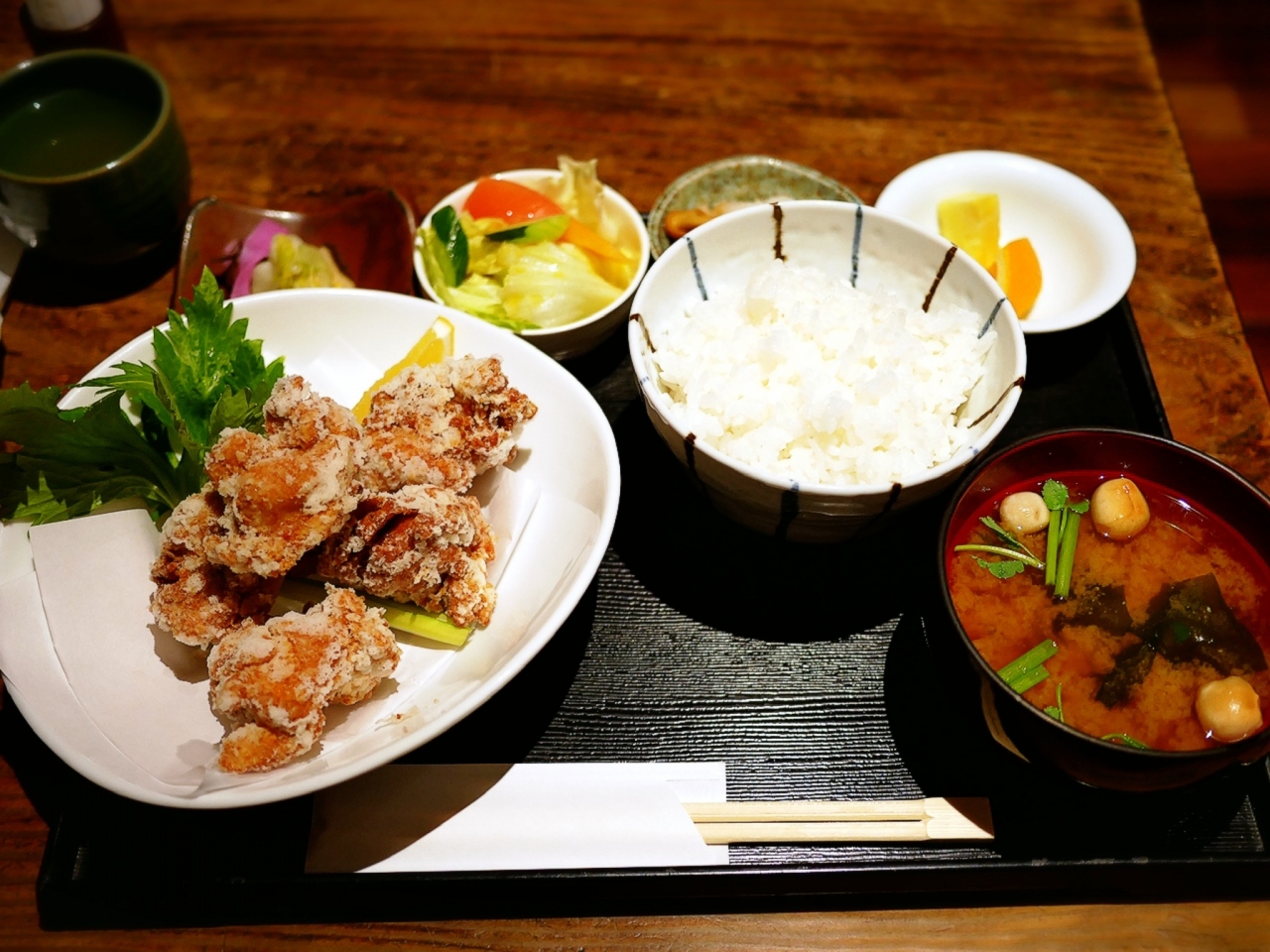 メインのから揚げ以外にも、小鉢や赤出しの味噌汁等、色々付いてくるのが嬉しいですね。
