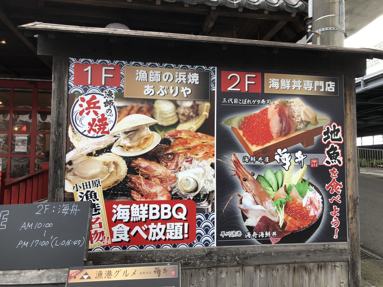 JR早川駅から徒歩5分、小田原漁港の上を横断する小田原ブルーウェイブリッジのすぐ下にお店があります。1階の入口前には、「1F 漁師の浜焼 あぶりや」「2F 海鮮丼専門店」と書かれた大きな看板があります。1階の入ってすぐの所は、海産物のお土産コーナーになっています。