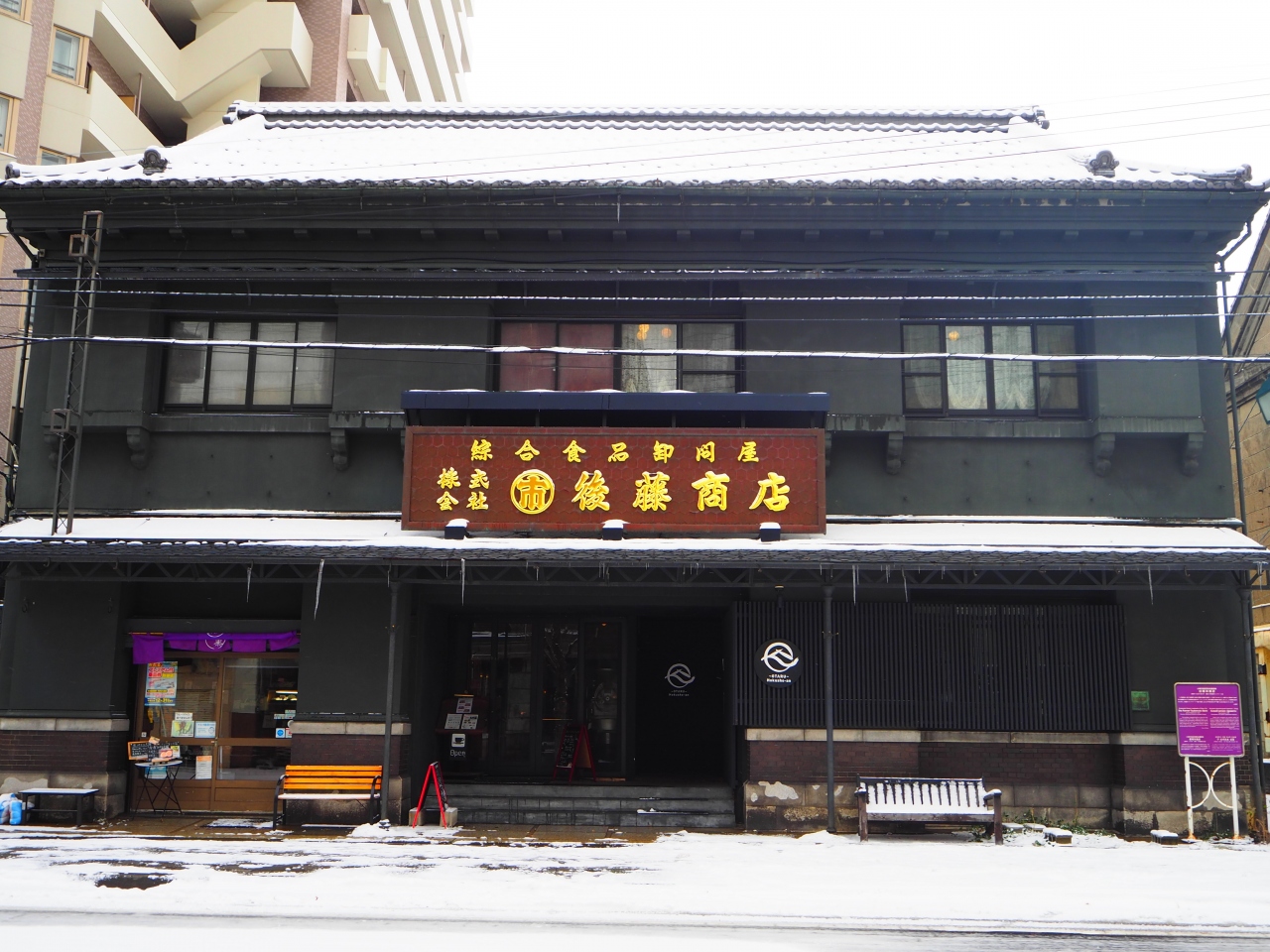 泊まったホテルの近くにあるカフェをグーグルマップで検索して行きました。1回目は暗くなった5時ごろに訪れた際、「塚本商店」という大きな看板がかかった日本家屋があるものの「色内食堂」という屋号がとてもわかりにくく気が付きにくいです。1階にはテイクアウトのスィーツ屋さんがあり、その横の入口らしき所に、メニュが置かれたスタンドがあったので、かろうじてカフェの入口と分りました。入口を入るとアンティークな金庫やカフェ備品が置かれてあり、2階へ案内する表示がありました。下調べをしていないと、そこにカフェがあるとは気づかないと思います。