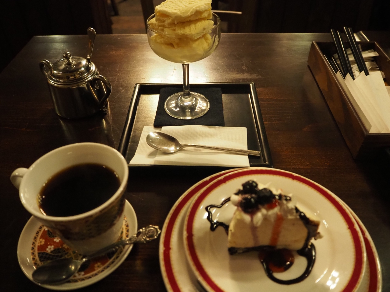 ケーキセットが590円とお手頃です。チーズケーキも美味しかったのですが、ついでに頼んだアイスクリームを食べた後に飲んだコーヒーとの絶妙な甘い香りはチョッと嬉しくなりました。
