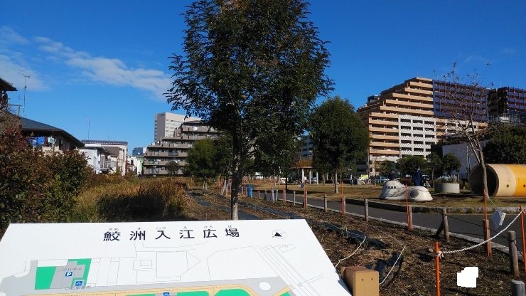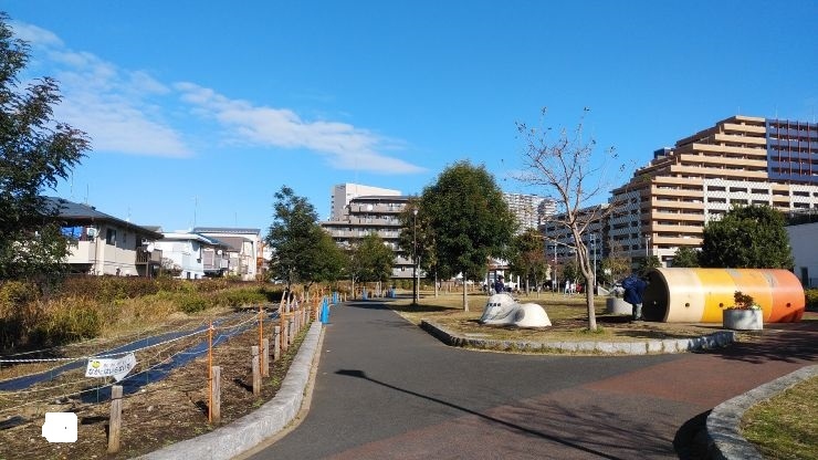 鮫洲駅から徒歩5分ほどのところにある公園。東京都下水道局鮫洲ポンプ所雨水貯留池の上部を整備し完成した公園とのことで、住宅やビルが無い一定の広さがあるので、空が広く感じられた。