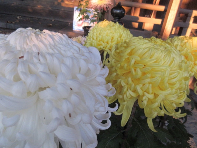 諏訪にある神社です。車でアクセスしました。夕方だったからかもしれないですが、静かな神社です。坂にある神社ですので、結構階段があります。境内には本殿周辺に、立派な菊の展示もありましたし、紅葉をした木々もありました。