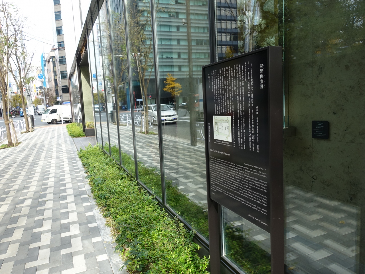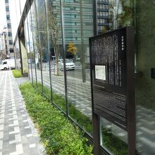 三原橋交差点から昭和通りを新橋方面にワンブロック、11月末に新規開業した「ホテルグランバッハ東京銀座」のすぐ前に案内板があります。永らく工事が行われていた場所で、現在の案内板は今年の7月につくり直された真新しいものです。古地図入り、漆黒の地色に白い字で記載されており、スタイリッシュなホテルの外観ともよくマッチするものでした。