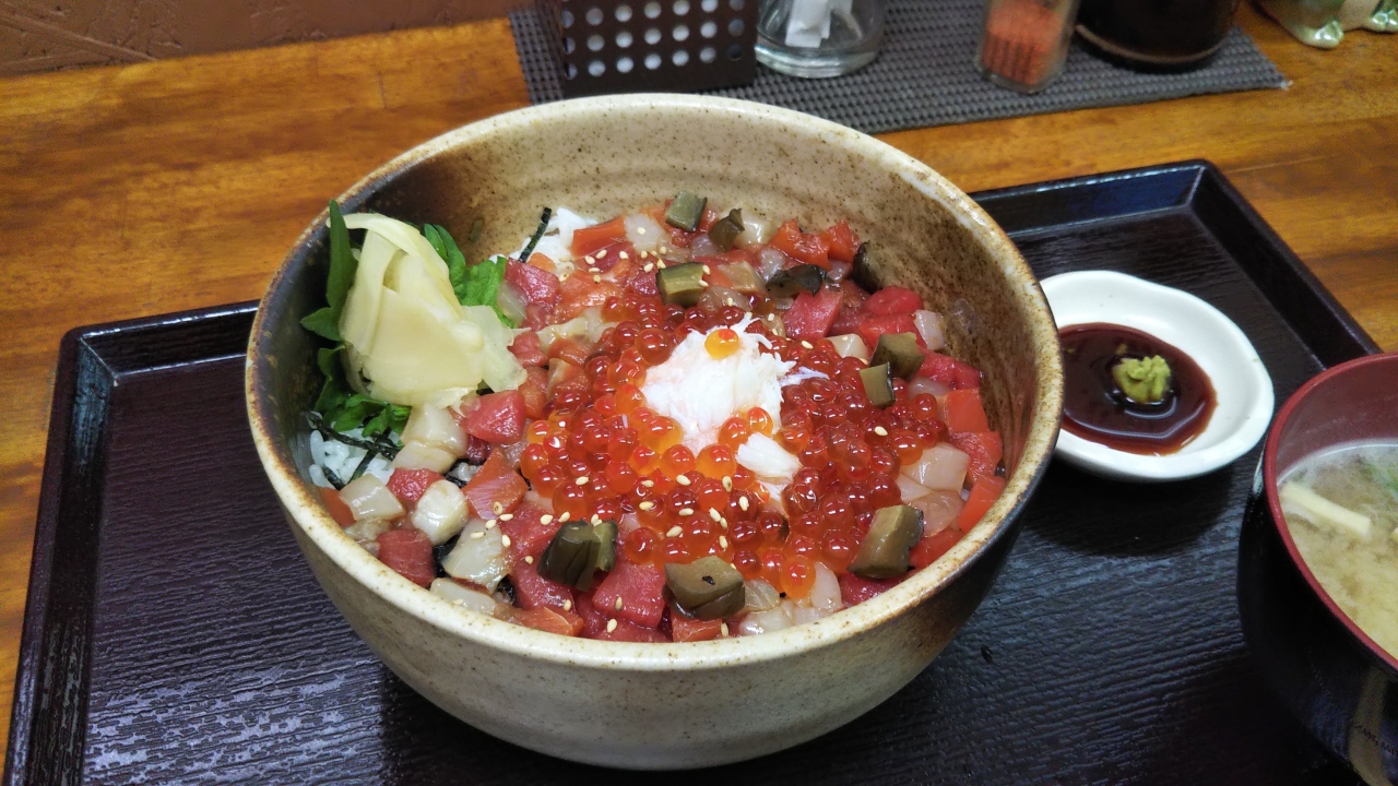 ばらちらし丼はカニ、赤身ぶつ切り、漬物、いくらなどを和えて食べるような感じ、とろろは個人的に朝からは苦手なので抜いてもらいました。ふつうに食べてもとても美味しかったのでうが、ガリも一緒に和えて食べるとよりアクセントが際立って美味しかったです。