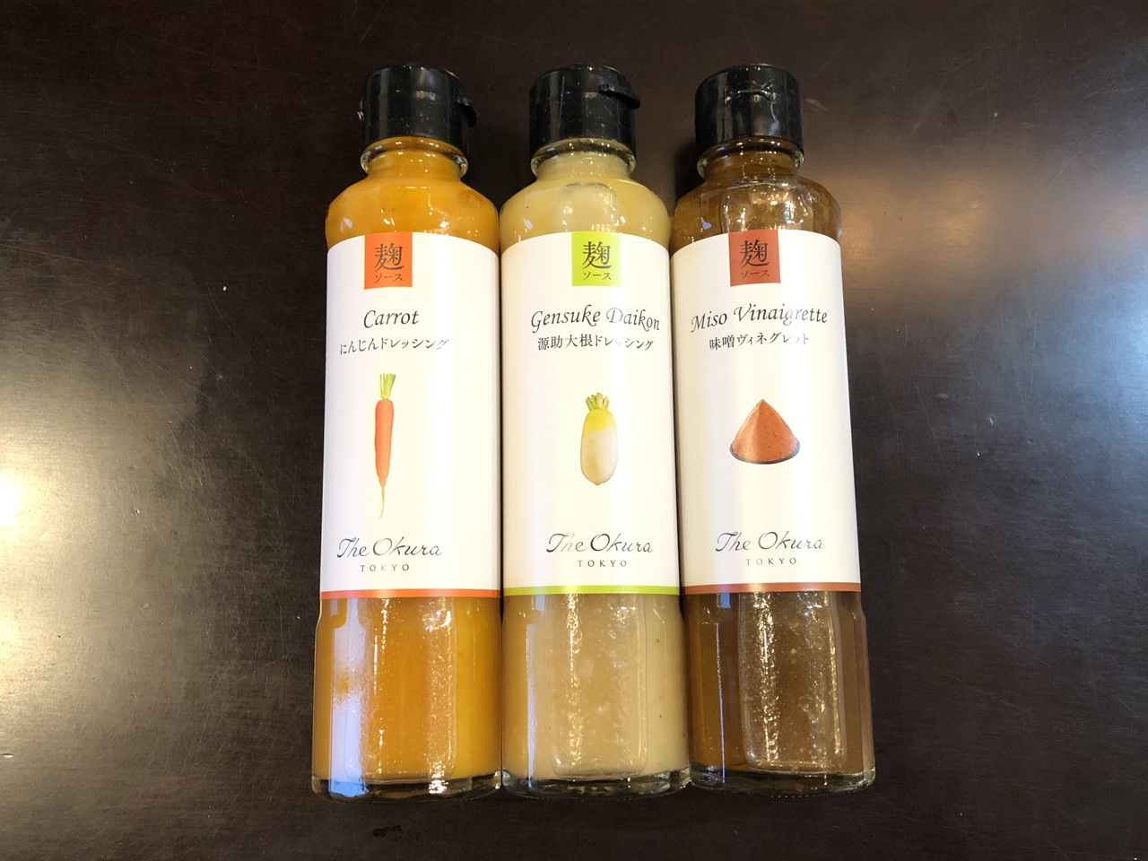 今回はレストランで出てきてとても気に入ったドレッシングを購入しました。大根、人参、味噌と3種類ありますがどれも良いです。ガラス瓶なのでちょっと重かった。