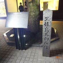 1987年に発掘調査が行われ,平安時代後期の遣水跡である三条大路南側溝や建物跡などが見つかり、石碑が建てられたようです。