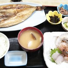 オーダーしたのは、ホッケ焼きと刺盛、ホタテ焼きの大漁定食。そして鰊刺身、ほっけのすり身揚げ。