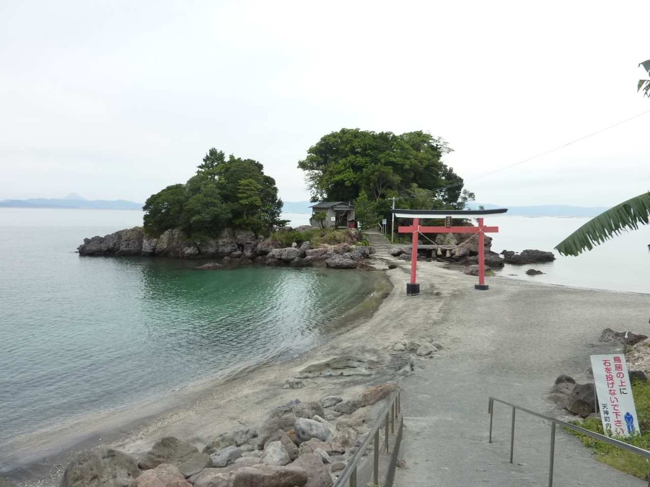 開聞岳をバックに映える海の中に伸びる神社