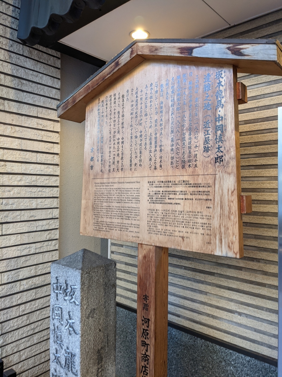 河原町通りを歩いていると、かっぱ寿司の店舗前に「坂本龍馬中岡慎太郎遭難之地」の石碑と案内板がありました。当時の面影は全くありませんでしたが、坂本龍馬と中岡慎太郎が暗殺された歴史的にも超有名な「近江屋事件」がこんな街中であったことを知り驚きました。
