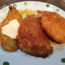 オムライスをメインにヘレカツ、エビフライ、クリームコロッケの入ったトリプルセットをオーダー。