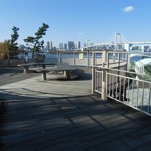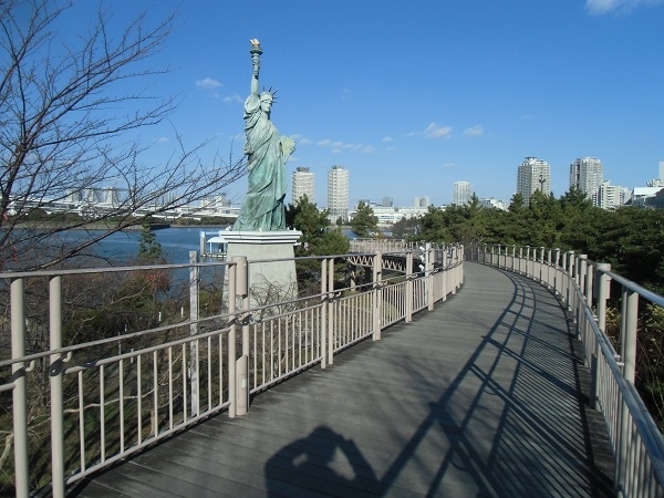 お台場海浜公園の展望デッキから自由の女神像の脇を通って水上バス乗り場方面へゆるやかに下っていく、木製の散歩道です。