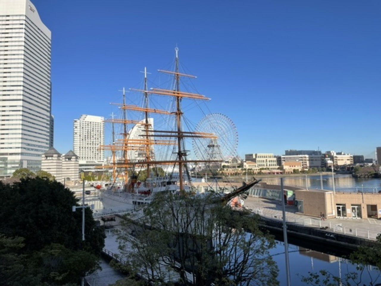 みなとみらいにある日本丸は、その白く美しい船体がとても優雅で、みなとみらいに来て日本丸を見ると、とてもウキウキした気分になります。今日は特に天気が良かったので、青い空に照らされた水面に浮かぶ日本丸がとても素敵でした。