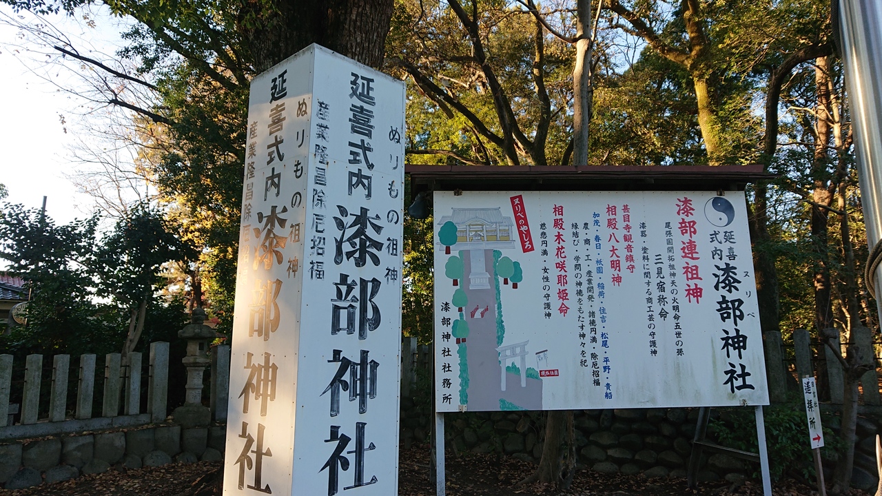 甚目寺駅近くに立地する神社です。12月中旬に、甚目寺を訪問した際に、すぐ脇に見かけて、立ち寄りました。案内板に記された説明によると、漆器や塗料に関する商工業の守護神であるとのこと。かつて、そういった産業の栄えた、この地域らしい神社だな、と感じました。