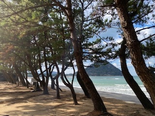 海水浴シーズンを大きく外した12月にここを訪れてみました。日本海側の波は荒く波打ち際まで近付く事はできなかったのですが、ごみ一つないきれいな海岸線が印象的でした。海岸の西側には指月山が見え、なかなか景色の良いシチュエーションでした。