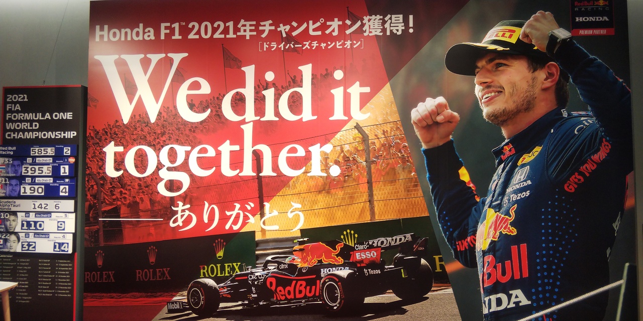 2021年のF1ワールドチャンピオンを獲得したマックスフェルスタッペンのレッドブルマシンの展示がされていました。他にもF1のアルファタウリ、motogpやスーパーフォーミュラのマシンも展示されており、楽しめます。イベント展示なので、hpみていきましょー。