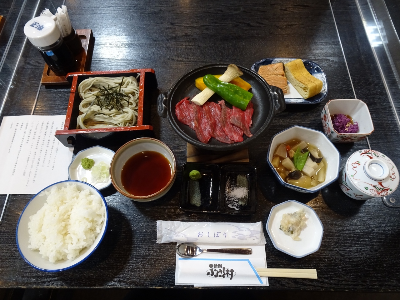 ここで新潟の郷土料理、へぎそばと越後牛の陶板焼きをいただきました。