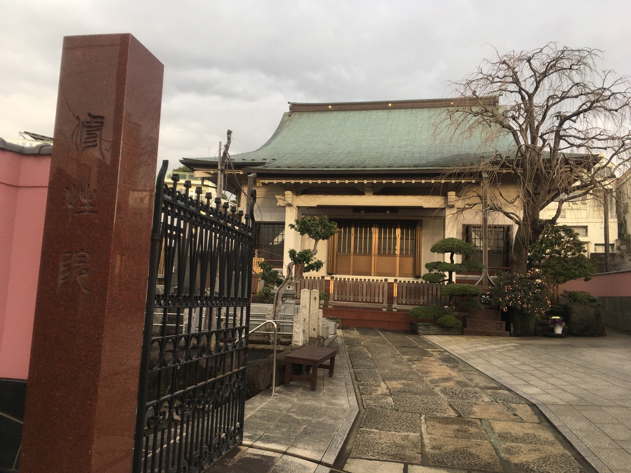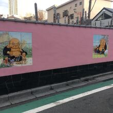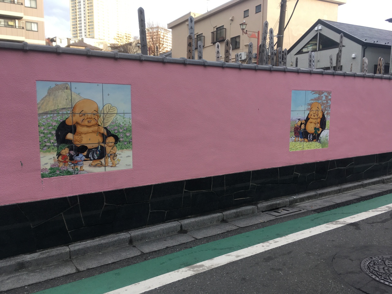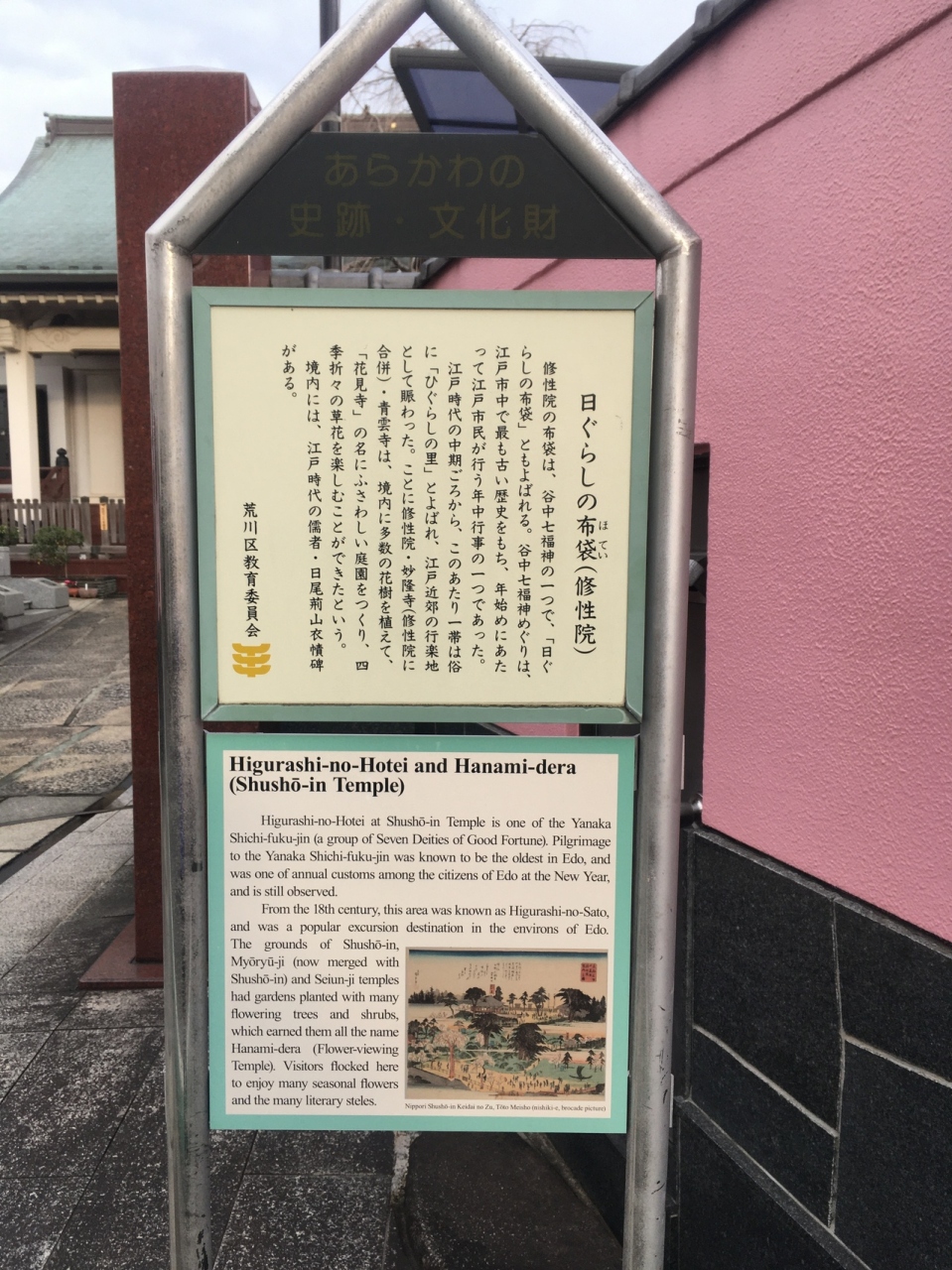 西日暮里駅から徒歩で10分ほどです。富士見坂下の北側です。「しゅうしょういん」と読みます。日蓮宗の寺院でお隣の青雲寺とともに「花見寺」と呼ばれ歌川広重「名所江戸百景」の「日暮里寺院の林泉」にも描かれています。当時は境内に仮山や多数の花樹を植栽し、文人も多く訪れたそうです。谷中七福神の「ひぐらしの布袋」が祀られています。お寺を囲む塀はピンク色でユーモラスな布袋さんのイラストがいくつも描かれています!