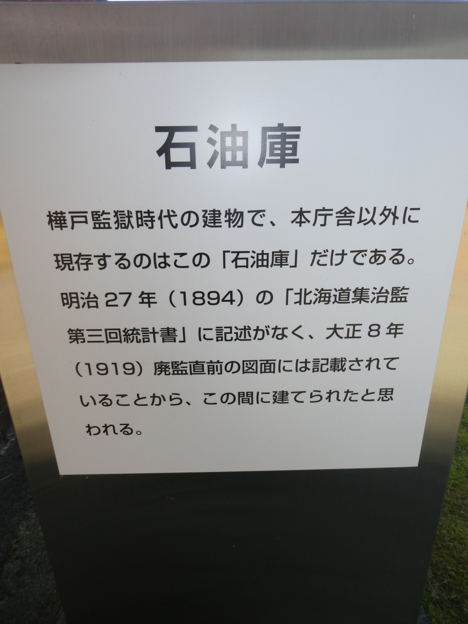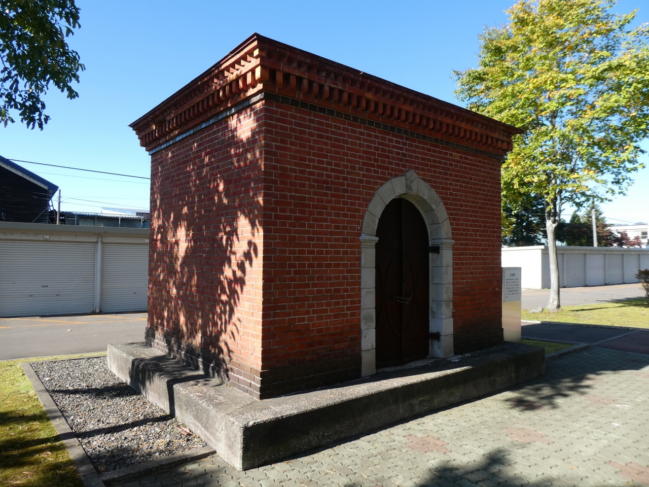 この旧樺戸集治監本庁舎(月形樺戸博物館)の裏側に煉瓦造りの小さな建物が有るのですがこれが樺戸集治監時代の石油貯蔵庫で明治27(1894)年から大正8(1919)年の間に建てられた本庁舎と共に現存する同時を忍ばせる建築となっています。