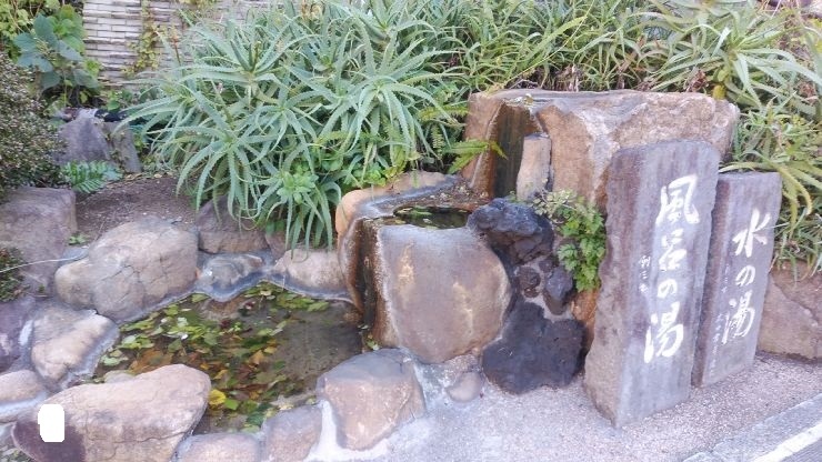モニュメント上部の岩場から温泉が湧き出ていたが、湯量はそれほど多くなく、湯気もなく温度は低かった。風呂の湯と水の湯はそれぞれ別の場所にあった源泉のようだが、この場所にまとめられているようだった。石碑をめぐり雰囲気と歴史を感じることはできた。