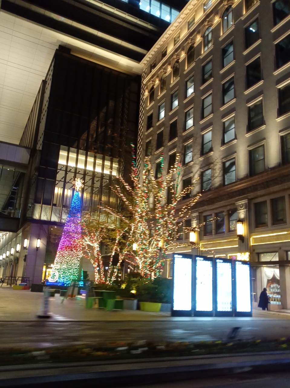 東京・京橋にある『京橋エドグラン』にも、クリスマスツリーが設置されています。京橋エドグランと明治屋京橋ストアーの間にあり、ビルとビルの合間にあるので、イルミネーションが目立ちます。綺麗なレインボーカラーのイルミネーションのクリスマスツリーです。