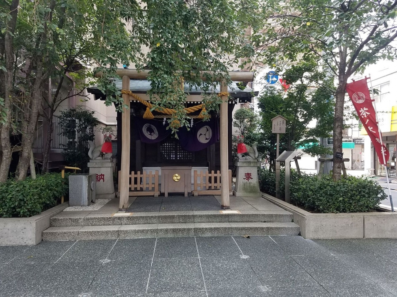水天宮前の交差点から一本入った通りを歩くとありました。左右にお狐様が居るので稲荷神社ですね。鳥居をくぐったらすぐ拝殿のコンパクトな神社です。江戸時代からあって周囲に茶の木が植えられていたことが由来とのこと。周囲も含めて永年火災が起きなかったので火伏の神様と言われているそうです。こういったご利益があると近隣の人々から頼りにされそうですね。