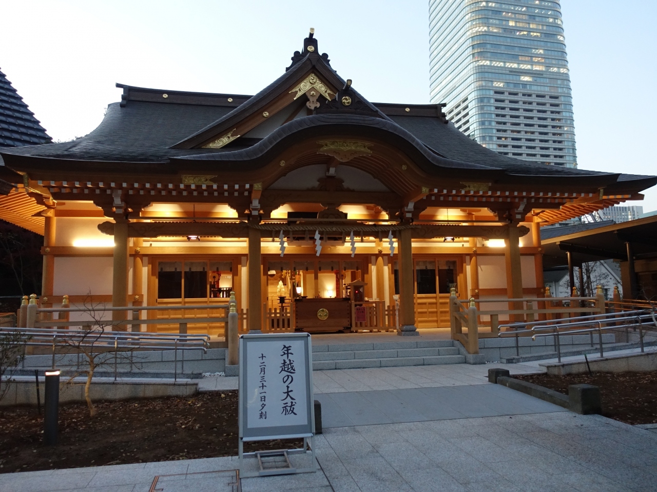 ほぼ1年半ぶりに西久保八幡神社を訪れました。前回は大規模工事の真っ最中でしたが、今回は白木が印象的な真新しい社殿の姿がありました。まだ工事中の箇所は多く残っており、風情ある光景は望めませんが、夕闇に浮かび上がる社殿は印象的でした。