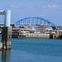 石垣島の離島ターミナルから景色を見ていたら、青いしゃれた橋が見えました。埋め立てた人工ビーチにかかっているサザンゲートブリッジでした。そばには行きませんでしたが、風景の一部に半月の青い橋が見えて、なかなかの眺めでした。