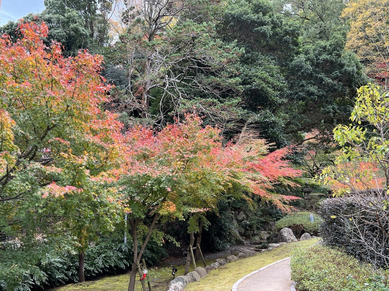 JR湯河原駅から路線バスで10分、温泉場中央バス停の前に、レンガ風のタイルで装飾された3階建の美術館があります。この建物の奥には、入場無料で自由に入ることができる庭園があり、自然の山を背景に、四季の花や木を楽しむことができます。