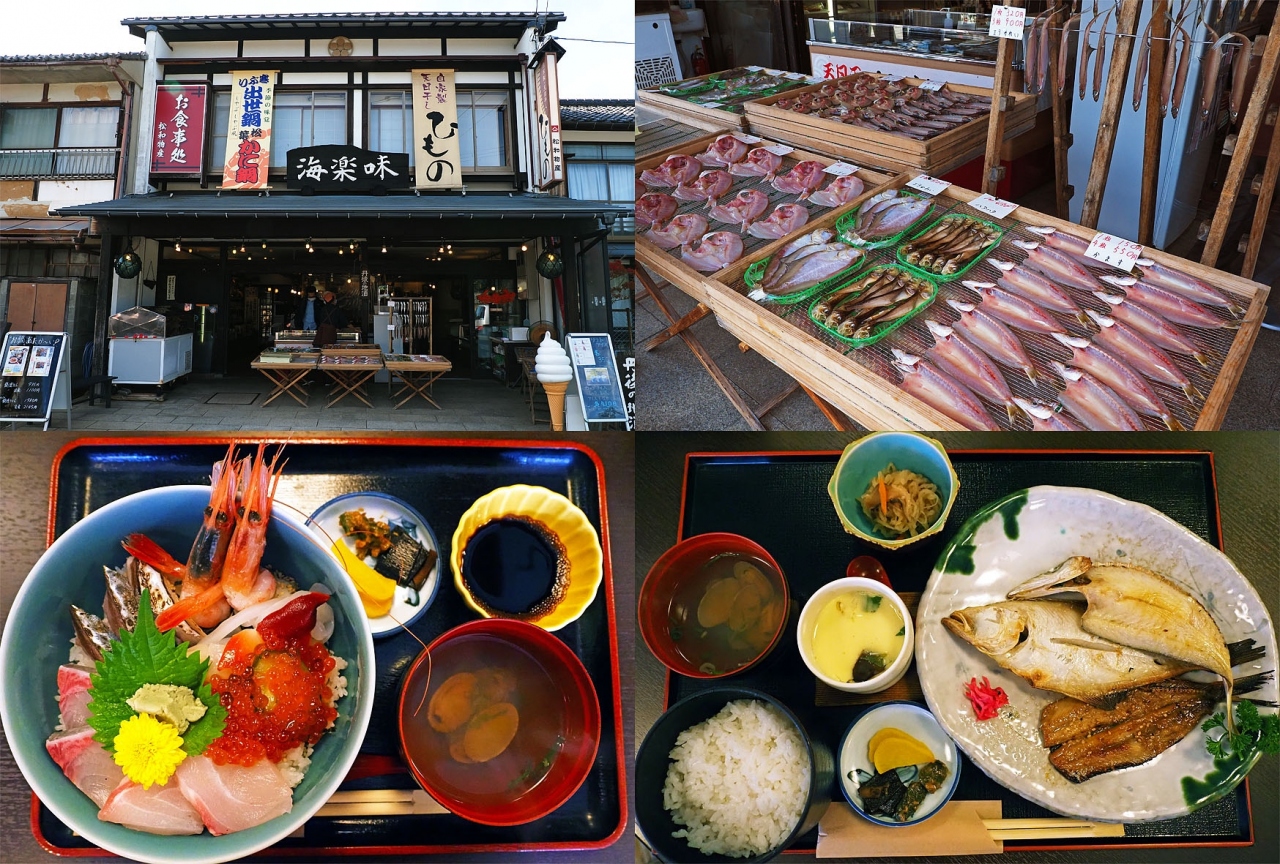 食事処では日本海の幸が楽しめるMenuが色々あって迷ったけど、7種類の海の幸がのっている海鮮丼と、3種類の自家製ひものが食べ比べできる自家製ひもの定食を食べましたが、どちらも大変美味しくて大満足でした。