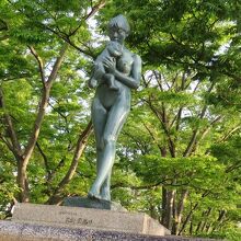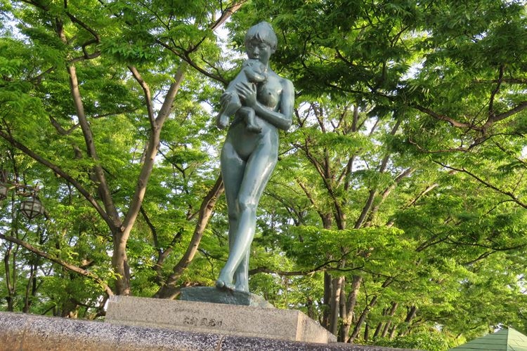石山公園に設置されている母子のブロンズ像。岡山市が平和都市宣言をした30年ほど前に制作されたそうだ。台座の位置が高いのでつい見上げてしまいますね。ただ平和都市宣言は多くの街で行われているはずなので、像の意匠含めありふれた感じではあります。