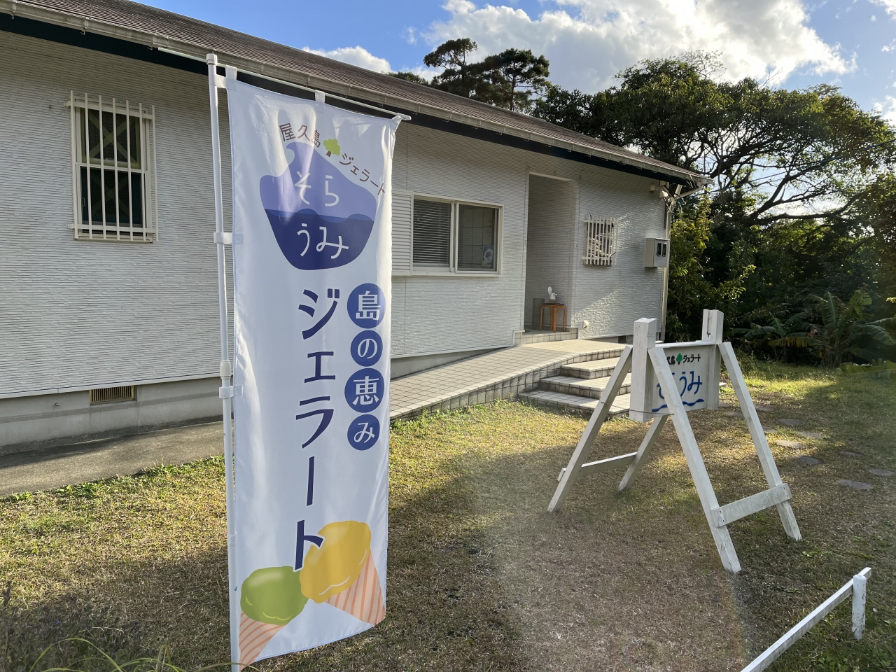 屋久島の食材を使った自家製ジェラートが食べられます。この日のメニューには、たんかん、島バナナ、グァバ、屋久島茶など8種類がありました。ジェラートは、シングルからトリプルまであり、ダブルにしました。カップが最中になっているので、全部食べられます。