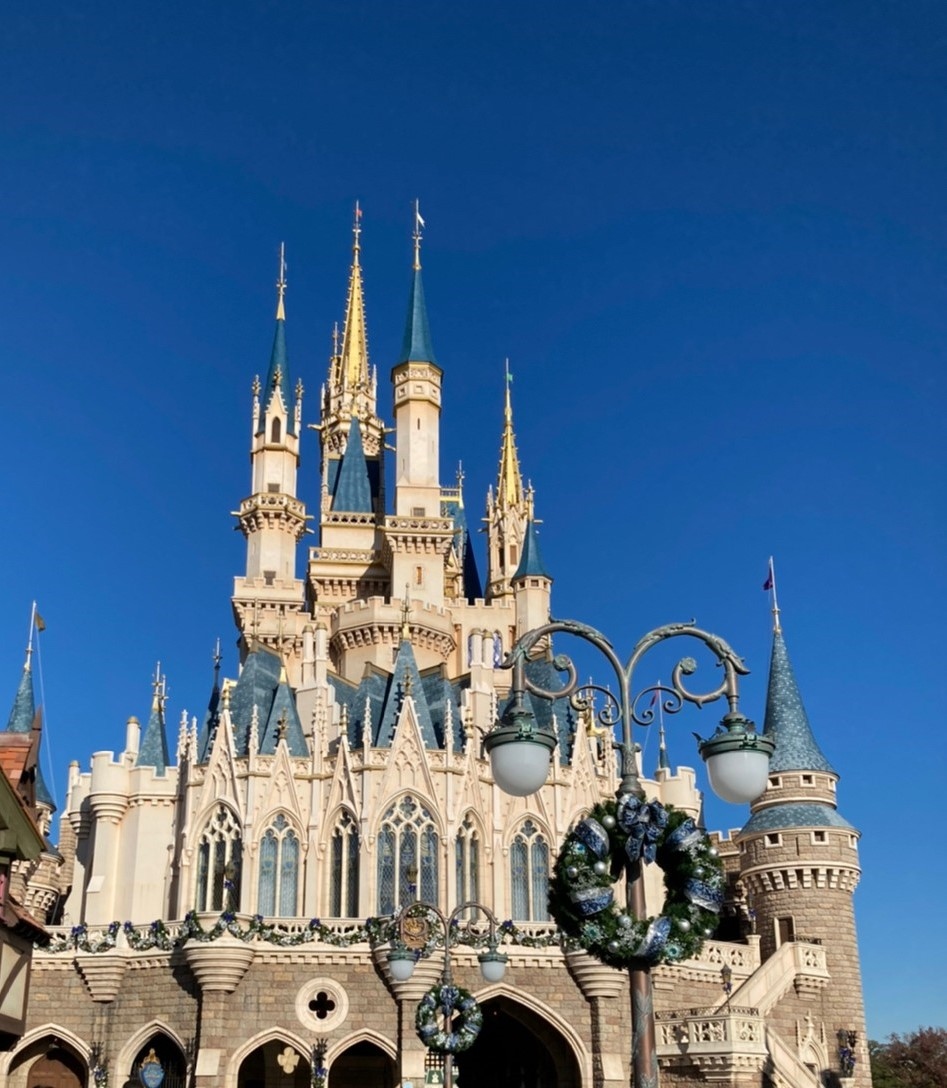 正面のシンデレラ城の周りにはキャラクターのクリスマスフラッグがあってかわいかったです。一つずつ写真を撮りました。ファンタジーランド側にはストリートライトにブルーのリボンのオシャレなリースが飾られていて、シンデレラ城の屋根と青空と素敵な眺めでした。