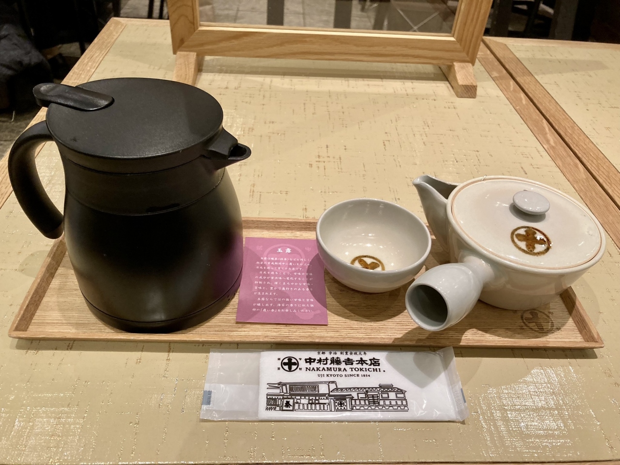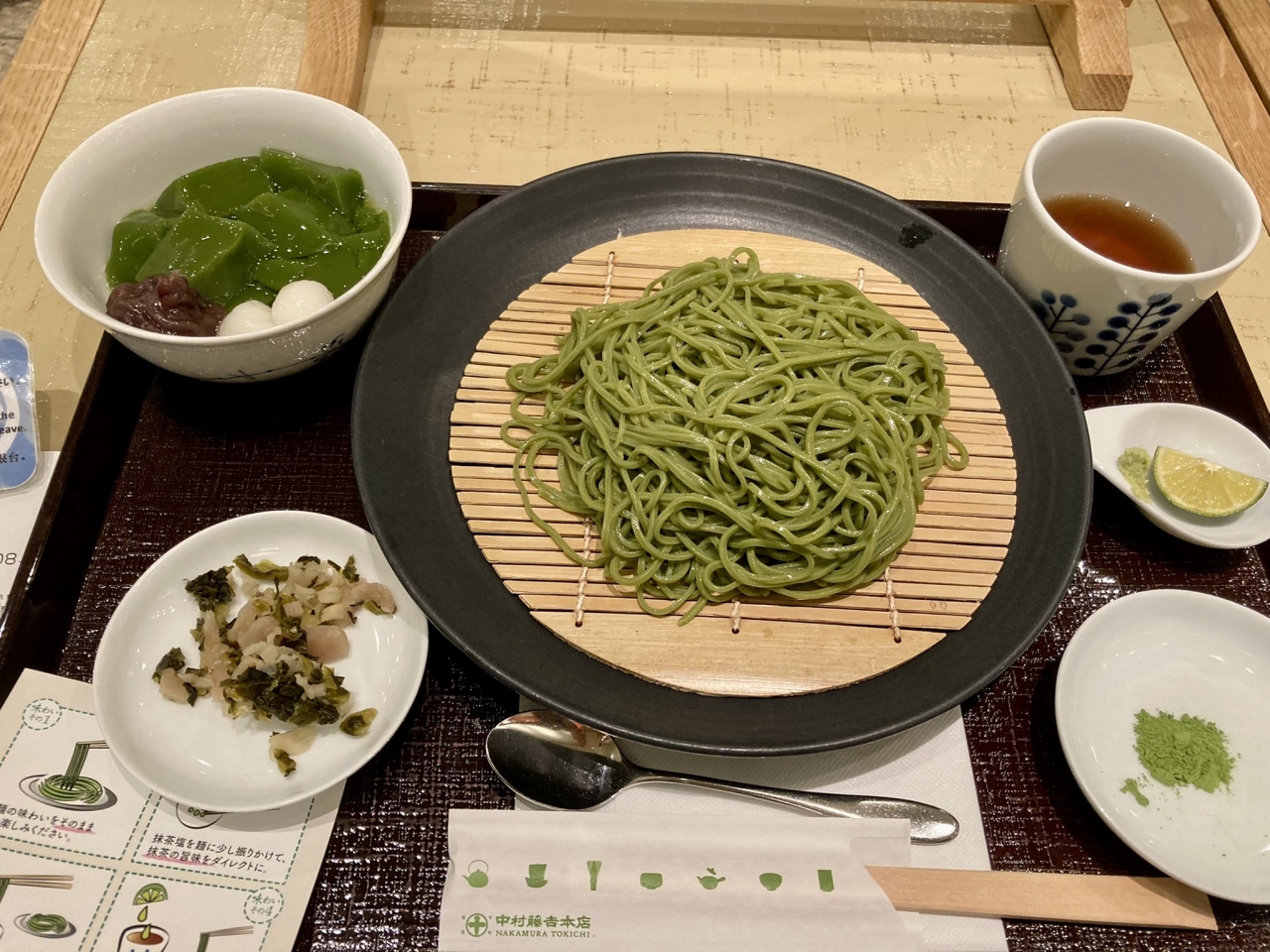 軽くランチをしたい、と思いついたのが中村藤吉の茶そばセット。こちらのお店は女性お一人様が多いので気軽に利用できます。以前いただいた茶そばセットは、ご飯とミニゼリー付きでしたが、今回は二者択一。ご飯の代わりにミニゼリーを普通サイズにすることができました。女性にはうれしい選択肢です。