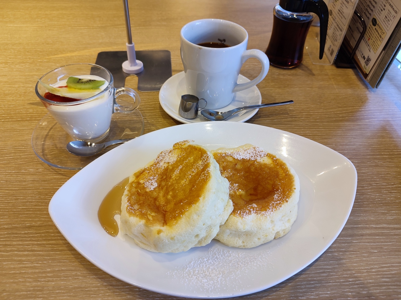 末広町から歩いて5分くらいでした。ふわっとろパンケーキが食べたくて行きました。パンケーキが出来上がるまで20分くらいかかります。まずコーヒーが出てきたのですが量が多くて飲みきれないくらいでした。パンケーキは名前の通りふわふわで美味しかったです。店内も明るい感じでゆったりしていてくつろげる雰囲気でした。