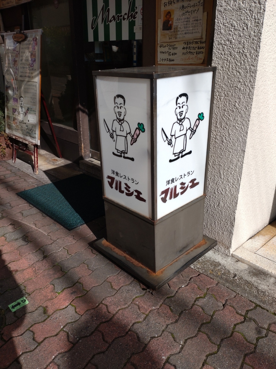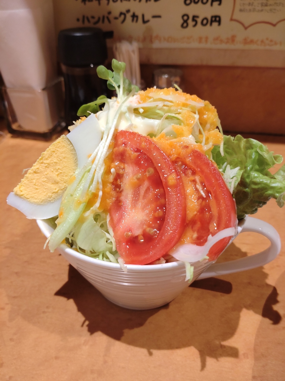 山手幹線沿い、地下鉄県庁前駅から徒歩7分、神戸高速花隈駅から10分のところにある洋食店。神戸花隈で人気のお店で、新聞や雑誌で取り上げられたことも多く、某サイトの洋食百名店にも選出される有名店。営業時間は、11時半から15時のみ。開店前の11時20分くらいに行きましたが既に行列が出来ていました。カレーソースはもちろんデミグラスソース、にんじんドレッシング、マヨネーズ、タルタルソースなどなどすべてのソースは自家製・手作り。ハンバーグやとんかつにもかなり惹かれましたが、今回は、一番人気というとんかつカレーをオーダー。待つこと5分くらい、運ばれてきたとんかつカレーは、大皿を埋め尽くす巨大なとんかつとカツの上に遠慮なくかかったカレーソースに圧倒されます。お店によると、カレーソースは、玉ねぎ、人参、トマト、セロリ、りんご、にんにく、生姜、パセリなど12種類以上の野菜と、カルダモン、ターメリック、グローブ、ナツメグ、メース、シナモン、オールスパイスなと16種類のスパキス、さらにオルガノ、バジル、タイム、ローズマリーなど8種類のハーブをシヨウ。小麦粉は一切使わず、野菜とフルーツがつなぎとなっていて、3日かけて作るとのこと。食べてみると、ルーはかなり独特。フルーティながらもガラムマサラとクミンなどのスパイスが強いものの、甘酸っぱくこれまで味わったことがない独特のもの。小麦粉を使っていないので、とろみはあまりありません。とんかつは肉厚なロースを使用。衣は薄めで、肉の味がしっかりとした洋食屋のカツレツで美味。また、是非食べたいのがサラダ。スイス・ジュネーブのレストランLa Contionで学んだという人参をたっぷり使ったドレッシングを使用しており、これかキャベツの千切りとの相性が抜群。野菜がいくらでも食べられそう。次回は何を食べるか、楽しみになるお店です。