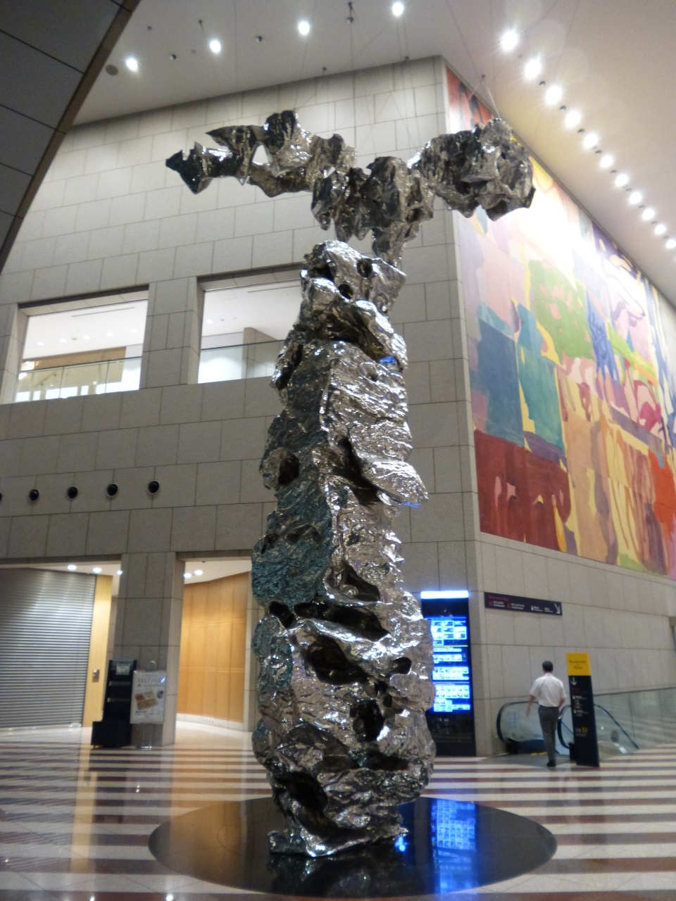 「ザ ロイヤルパークホテル アイコニック 東京汐留」に宿泊した際、夕食後にシオサイトを散策しました。汐留シティセンターは、鉄道ファンにはなじみ深い旧新橋停車場のすぐ近くにあります。シオサイトの複合商業施設の中では今ひとつ印象の薄いビルで、利用頻度は低いですが、エントランスホールの吹き抜け空間に設置された前衛的なオブジェはなかなか見ごたえがありました。