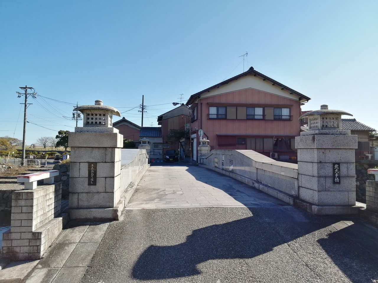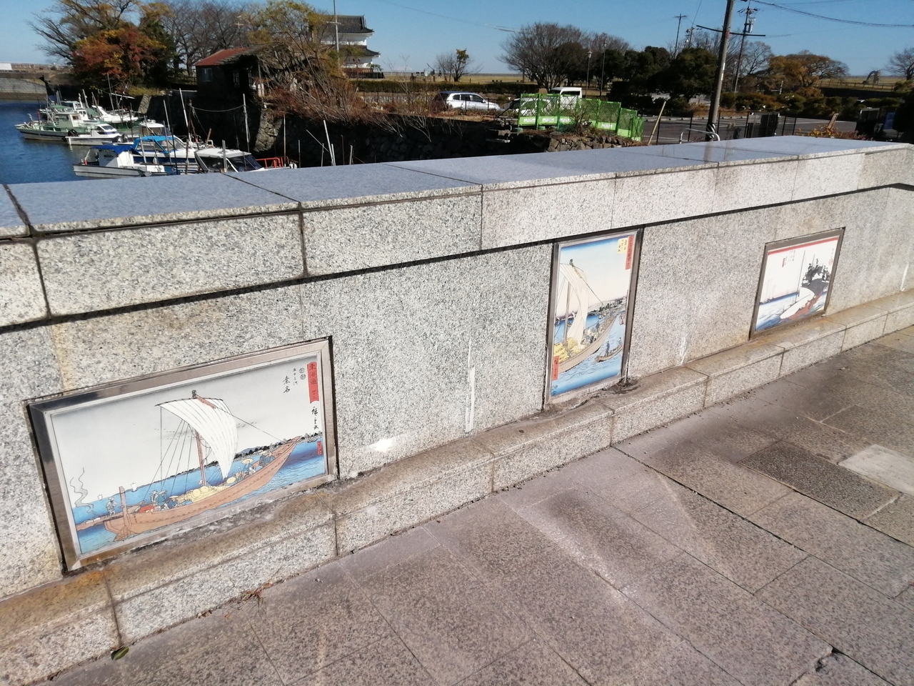 桑名城址の堀にかかる橋です。かつての城に入る2箇所の入口のうちの1つとのこと。現在はきれいに成形された石材を使った重厚感のある石橋となっています。欄干部分には昔の版画からとった江戸時代の桑名城周近の様子がタイルに焼かれてはめ込まれています。