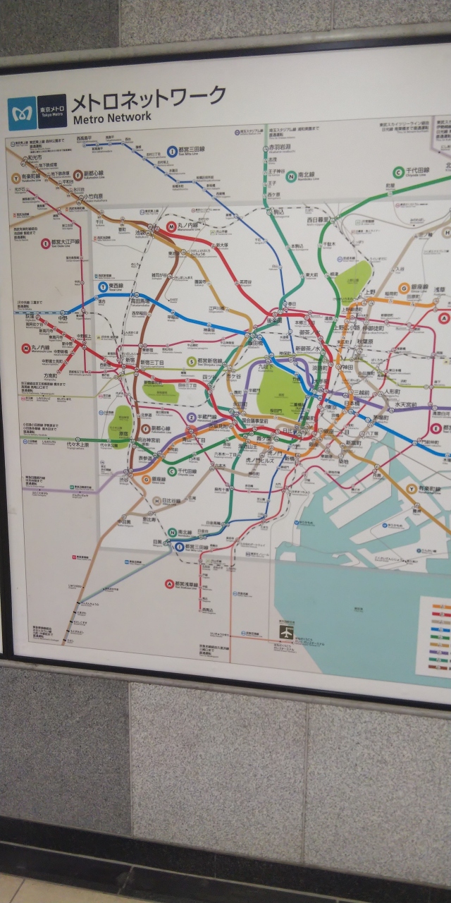東京メトロの日比谷線は都営地下鉄の路線のひとつです。東京出張の際に2回利用しました。日比谷駅から築地駅までと築地駅から八丁堀駅までです。2回とも座れて良かったです。築地駅は歩道から地下に降りる入口が狭めでした。