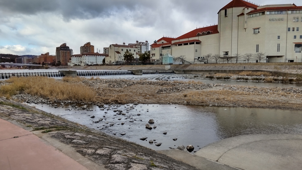 生のオブジェは、宝塚駅と宝塚南口駅の間の武庫川にあります。川の中にあり、石で「生」の字が大きく描かれています。阪急電車の車窓からは、よく見えます。河岸からは、石が積んであることしか分かりませんでした。このオブジェは、1995年の阪神大震災の犠牲者を慰霊するために造られたものとのことです。川の中にありますので、幾度か流され、現在のものは12代目とのことです。車窓から見ることをお薦め致します。