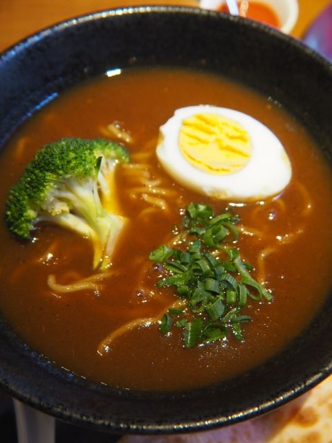 野菜を煮込み、インドのスパイスと合わせたスープで、肉は使っていない。宗教上の制約が色々あるインド人考案ならではのラーメンスープ。