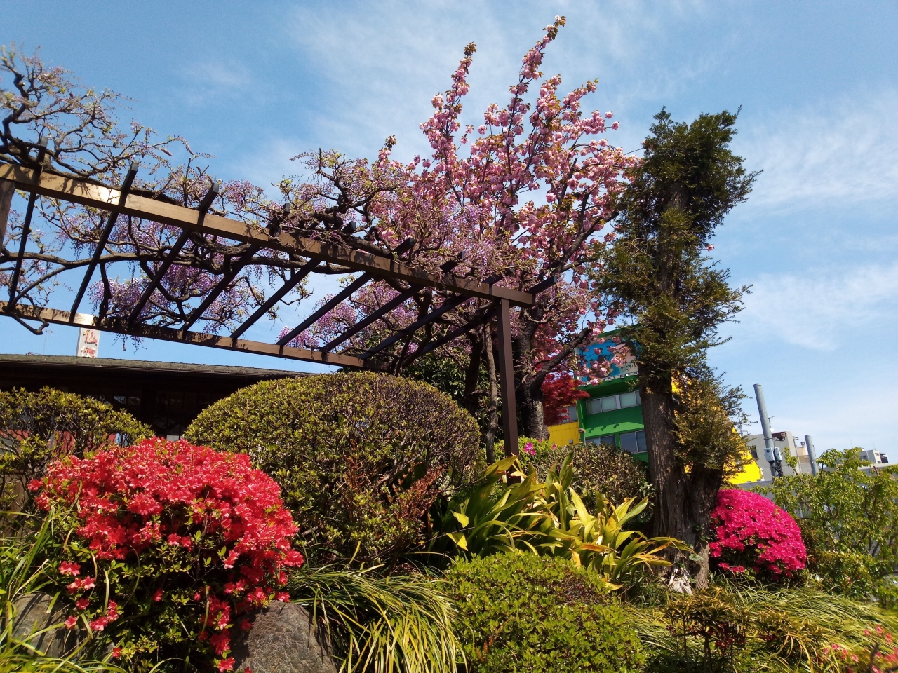 長命寺は、川越街道と環状七号線の角にあるごく普通のお寺です。今回の訪問時は、快晴で、添付写真のように、境内にあるツツジと桜の花が満開で最高でした。日本はどこでも手入れが良くきれいな所ばかりで、本当に快適な散策が出来ます。