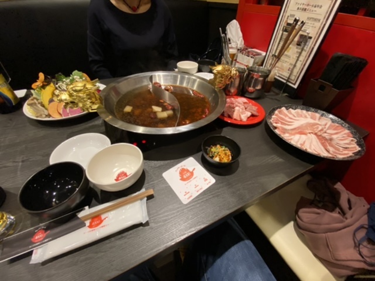 年末限定の飲み放題付きプランで行きましたよ。群馬の加藤ポークのお肉は美味しいですね。4種の肉とホルモンです。肉骨茶て麻辣の2種類のお鍋でいただきました。飲み放題付きで7,150円でした。