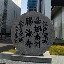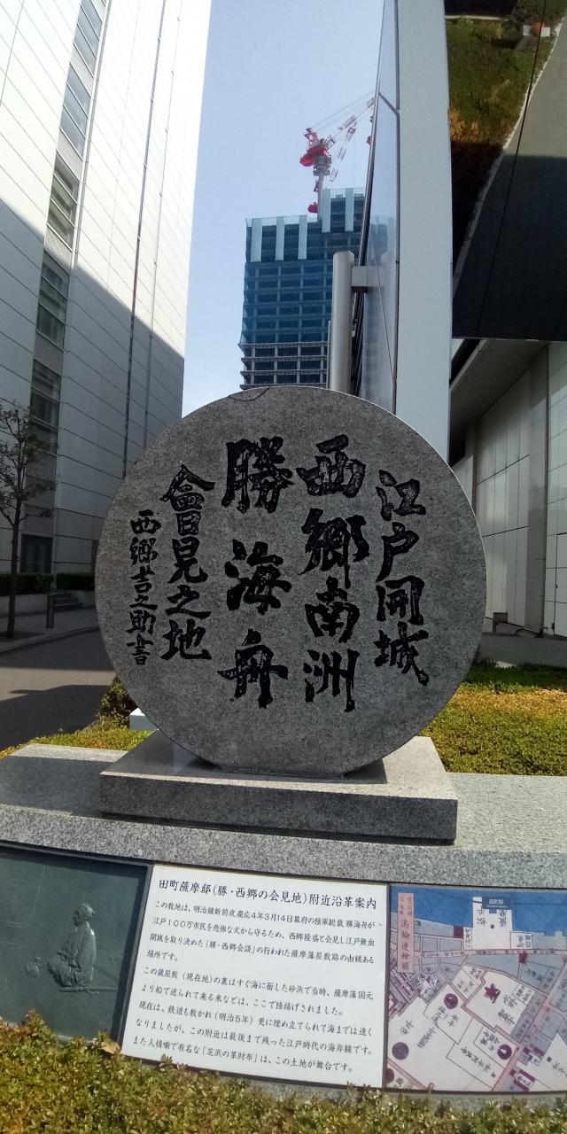江戸開城のきっかけになった西郷隆盛と勝海舟の会見の地は、東京タワーの南方にあって、添付写真のように、高層ビルの前に石碑があります。昔はこの辺が海岸線だったようで、明治維新後の東京の凄まじい発展を感じられました