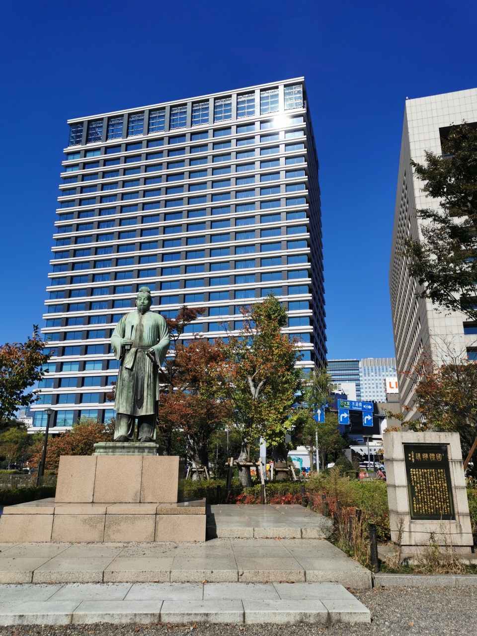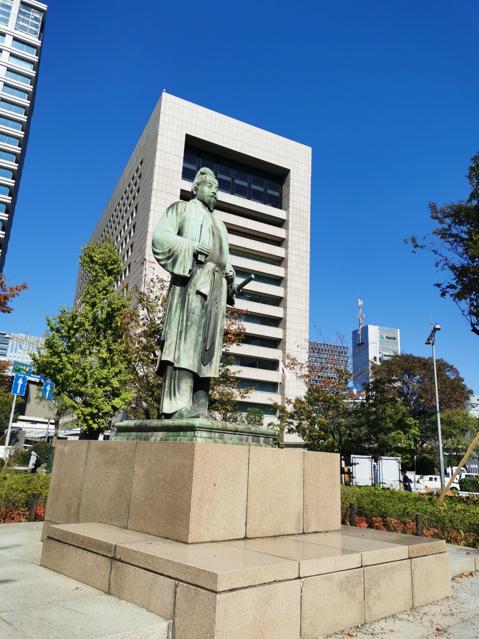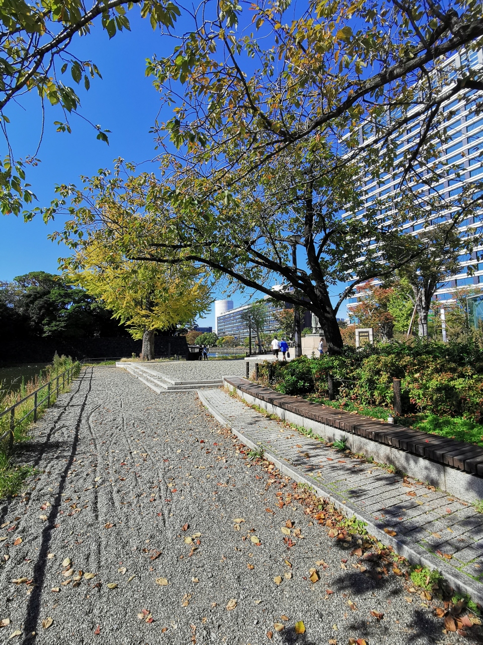 東京散歩で皇居東御苑へ。皇居東御苑内は江戸城の本丸・二の丸・三の丸の一部が公園となっているものです。大手門から江戸城跡である内堀沿いに10分ほど歩くと大手濠緑地があります。地下鉄駅の出口すぐです。三角形の公園。目の前はお堀。震災いちょうと和気清麻呂の銅像がたっています。砂利引きで少し歩きにくいですが眺めはとても良いです。